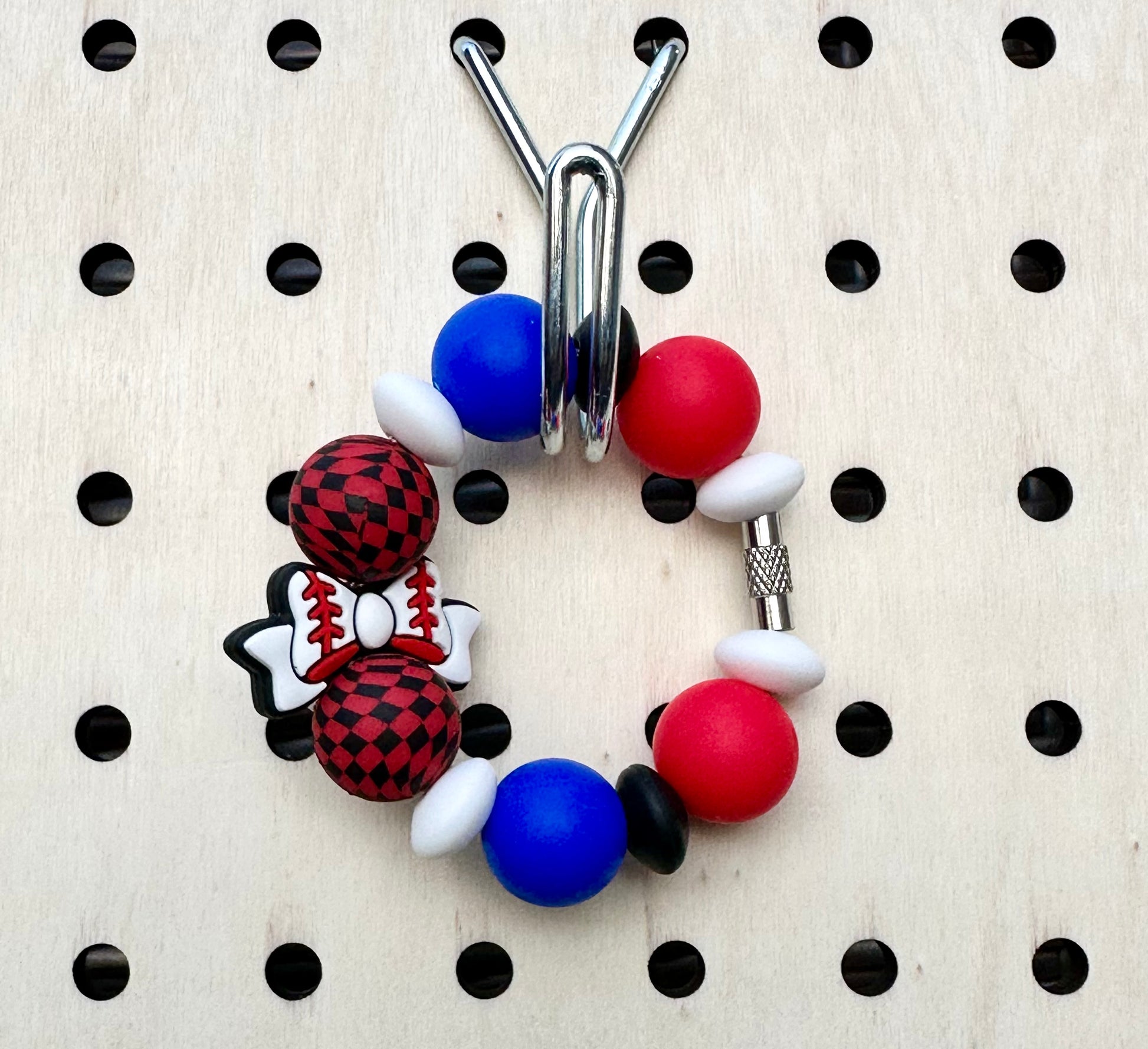 Boost your team spirit with our Baseball Bow Handle Charm. This charming cup accessory features a bow-shaped baseball focal bead, adorned with blue, red, and white silicone beads, perfectly matching your local team's colors. Show off your love for the game with this stylish and unique addition.