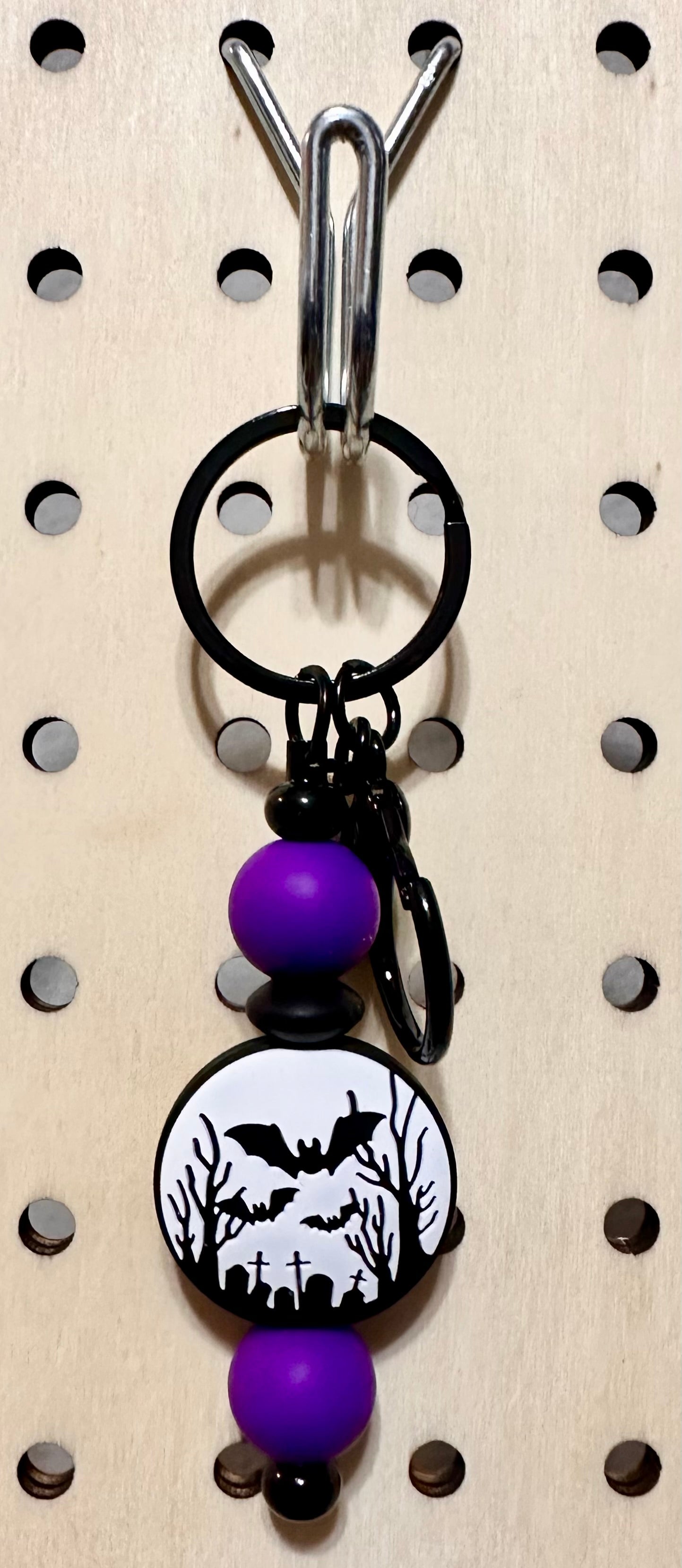 Enhance your keys with our Fricken Bats - Mini Keychain. This charm features a focal bead with bats soaring over a spooky graveyard, surrounded by black and purple silicone beads. Add a touch of Halloween to your style with this fun, unique accessory.